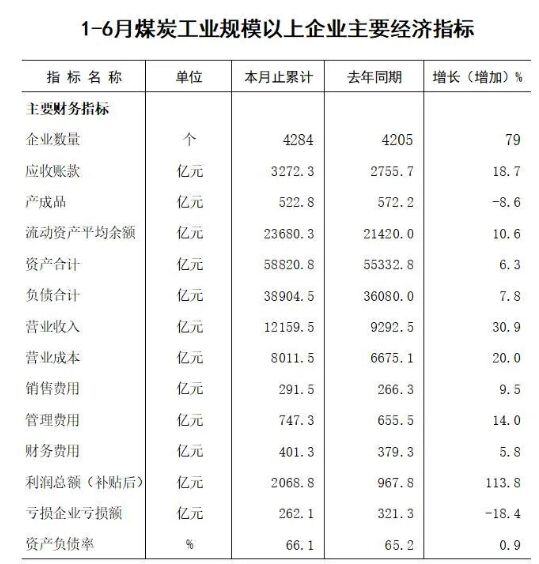 日前,2021年上半年全國(guó)規(guī)模以上煤炭企業(yè)主要經(jīng)濟(jì)指標(biāo)公布。 上半年,煤炭行業(yè)經(jīng)濟(jì)形勢(shì)總體穩(wěn)中向好,行業(yè)營(yíng)收及利潤(rùn)均實(shí)現(xiàn)較高增長(zhǎng),虧損企業(yè)虧損額下降;行業(yè)營(yíng)收增幅首次超過(guò)全國(guó)工業(yè)行業(yè)平均水平,企業(yè)資產(chǎn)負(fù)債率略有提高,應(yīng)收賬款增加。 指標(biāo)顯示,上半年4284家規(guī)模以上煤炭企業(yè)營(yíng)業(yè)收入12159.5億元,同比增長(zhǎng)30.9%,增幅比規(guī)模以上工業(yè)行業(yè)平均高3個(gè)百分點(diǎn);營(yíng)業(yè)成本8011.5億元,同比增長(zhǎng)20.0%;應(yīng)收賬款3272.3億元,同比增長(zhǎng)18.7%;利潤(rùn)總額(補(bǔ)貼后)2068.8億元,同比增長(zhǎng)113.8%。 上半年,規(guī)模以上煤炭企業(yè)資產(chǎn)合計(jì)58820.8億元,同比增長(zhǎng)6.3%;負(fù)債合計(jì)38904.5億元,同比增長(zhǎng)7.8%;資產(chǎn)負(fù)債率66.1%,比去年同期增加0.9個(gè)百分點(diǎn)。 指標(biāo)顯示,上半年,規(guī)模以上煤炭企業(yè)流動(dòng)資產(chǎn)平均余額23680.3億元,同比增長(zhǎng)10.6%;企業(yè)銷售費(fèi)用、管理費(fèi)用和財(cái)務(wù)費(fèi)用,分別較上年增長(zhǎng)9.5%、14.0%和5.8%。(數(shù)據(jù)來(lái)源國(guó)家統(tǒng)計(jì)局)