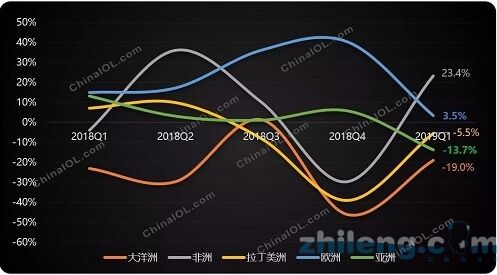 美的為了更快開(kāi)辟?lài)?guó)際市場(chǎng),搶占市場(chǎng)份額,與國(guó)內(nèi)市場(chǎng)的銷(xiāo)售策略一致,同步降低了出口價(jià)格。此外,美的利用其在海外完善的銷(xiāo)售渠道,自主品牌出口占比也有了提升。 TCL增長(zhǎng)有兩方面原因,一是采取集團(tuán)統(tǒng)一銷(xiāo)售的策略,TCL旗下有多媒體、手機(jī)、環(huán)境電器等多種產(chǎn)品,統(tǒng)一之后拓寬了銷(xiāo)售渠道;二是推出了一款體積更小、重量更輕的窗機(jī),在北美及歐洲很受歡迎,由此帶來(lái)了可觀的增長(zhǎng)。 海信在出口方面增長(zhǎng)最為亮眼,同比達(dá)到15.7%,并且在北美、拉美和亞洲均有不錯(cuò)的增長(zhǎng)。原因之一是得益于海信多產(chǎn)品、多渠道的協(xié)同作用,二是去年基數(shù)相對(duì)較小。 趨勢(shì):后續(xù)拐點(diǎn)已現(xiàn) 從分季度的各洲別出口增長(zhǎng)率情況來(lái)看,2019年一季度僅有非洲和歐洲有不同幅度的增長(zhǎng)。不過(guò)因?yàn)榉侵捱@幾年的出口表現(xiàn)一直不太穩(wěn)定,整體規(guī)模較高峰期出現(xiàn)較大萎縮,而且在全球市場(chǎng)中所占份額較小,不足以影響整體出口趨勢(shì)。歐洲這兩年一直保持了較高的增長(zhǎng),但今年一季度的市場(chǎng)增長(zhǎng)也出現(xiàn)疲軟,整體增速大幅收窄。 而主力需求區(qū)域亞洲的增長(zhǎng)率在步步走低。拉美地區(qū)的局勢(shì)也并不樂(lè)觀,整體降幅仍在雙位數(shù)以上。北美地區(qū)如前文所述,因?yàn)槊绹?guó)市場(chǎng)的提前透支出現(xiàn)雙位數(shù)下滑,從月度的趨勢(shì)來(lái)看也是如此,后續(xù)承壓顯著。