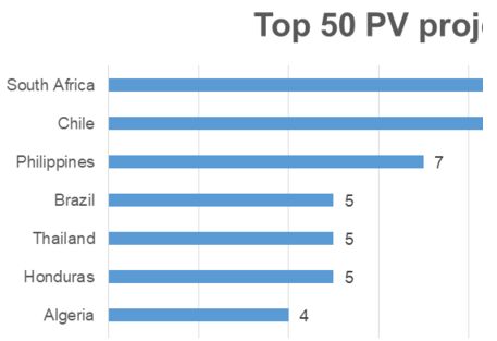 從裝機(jī)容量來(lái)看,智利以1652兆瓦排在第一位,其次是南非(1384.5兆瓦),巴西(764兆瓦),泰國(guó)(517.5兆瓦)和菲律賓(454.5兆瓦)。 菲律賓目前最大的在營(yíng)太陽(yáng)能項(xiàng)目是由Helios太陽(yáng)能公司開(kāi)發(fā)的Cadiz太陽(yáng)能項(xiàng)目,裝機(jī)容量達(dá)到132.5兆瓦。