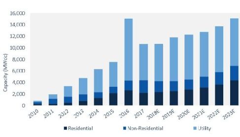 SEIA總裁兼首席執(zhí)行官Abigail Ross Hopper表示:“盡管有貿(mào)易摩擦和市場(chǎng)調(diào)整,但太陽(yáng)能行業(yè)去年的表現(xiàn)令人印象深刻。特別令人鼓舞的是,從東南部到中西部地區(qū),部署太陽(yáng)能的地理多樣性日益增加,導(dǎo)致總裝機(jī)容量增加了兩位數(shù)! 展望未來(lái),GTM和SEIA預(yù)測(cè)美國(guó)太陽(yáng)能市場(chǎng)將繼續(xù)保持增長(zhǎng),但“直到2023年才能達(dá)到我們?cè)?016年看到的令人驚嘆的創(chuàng)紀(jì)錄水平! 但是,新的太陽(yáng)能進(jìn)口組件征稅在未來(lái)幾年將明顯沖擊該行業(yè)的發(fā)展,但其影響又是不確定的。具體而言,GTM和SEIA預(yù)測(cè)2018年美國(guó)將會(huì)再增加10.6吉瓦太陽(yáng)能裝機(jī)容量,但美國(guó)光伏總裝機(jī)容量預(yù)計(jì)在未來(lái)五年增加一倍以上,到2023年每年增加的光伏容量將超過(guò)15吉瓦。