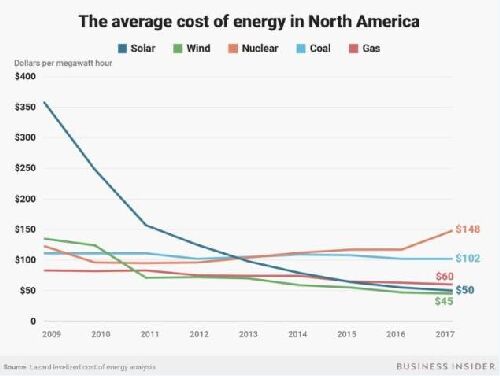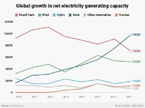 拉扎德公司的分析基于一種叫做平準(zhǔn)化發(fā)電成本(LCOE)的分析法,這是一種計算建設(shè)及運(yùn)營一座發(fā)電廠總生產(chǎn)成本的方法。 太陽能發(fā)電成本的迅速下降標(biāo)志著世界供電方式可能即將迎來一場巨變。價格的下降可能會促進(jìn)人們減少化石能源的使用,如石油和煤炭,轉(zhuǎn)而更多地使用可再生能源如風(fēng)電和太陽能。 改變能源體系、重視清潔能源的利用,是減緩氣候變化的唯一方式,因為化石能源的排放會導(dǎo)致更多熱量殘留在地球上。但是分析者早已指出,只有當(dāng)可再生能源的價格低于傳統(tǒng)能源時,能源利用方式的轉(zhuǎn)型才會真正加速。而可再生能源似乎已經(jīng)降價。 看一下全球范圍內(nèi)哪些類型的新發(fā)電能力出現(xiàn)增長,就會明顯看出可再生能源的崛起。聯(lián)合國環(huán)境規(guī)劃署(UNEP)的一份報告發(fā)現(xiàn),2017年,太陽能新增發(fā)電量超過了其它任何一種能源形式。