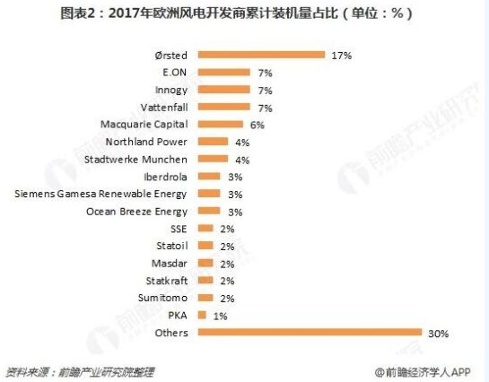 從企業(yè)角度來(lái)看,Ørsted是歐洲最大的海上風(fēng)電開發(fā)商,2017年底累計(jì)安裝量占?xì)W洲總裝機(jī)量的17%,比2016年略有增加。第二至第五名依次是E.ON(7%),德國(guó)能源巨頭Innogy(7%),Vattenfall(7%),Macquarie Capital(6%)。這排名前五的開發(fā)商總裝機(jī)量占?xì)W洲總額的44%,比2016年底略有減少。