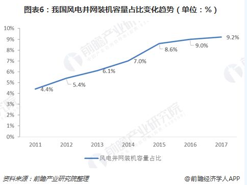 近年來,風(fēng)電并網(wǎng)裝機(jī)容量在發(fā)電設(shè)備裝機(jī)總量中的占比不斷提高,整體呈現(xiàn)逐年上升的趨勢。我國風(fēng)電并網(wǎng)裝機(jī)容量占全部發(fā)電設(shè)備裝機(jī)容量的比例由2011年的4.4%上升至2017年的9.2%。根據(jù)國家統(tǒng)計(jì)局?jǐn)?shù)據(jù)顯示,2017年,風(fēng)電發(fā)電量約為3057億千瓦時(shí),約占全社會(huì)用電量的4.8%,風(fēng)力發(fā)電已成為我國清潔能源發(fā)電方式中不可缺少的一部分。 2017年我國風(fēng)電并網(wǎng)裝機(jī)容量占全部發(fā)電設(shè)備裝機(jī)容量的比例為9.2%,低于全球清潔能源裝機(jī)量(含水電)占全部裝機(jī)量的比例,去除水電部分,按單個(gè)國家來看,我國風(fēng)電并網(wǎng)裝機(jī)容量仍排在全球前列。
