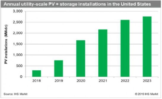 根據(jù)儲(chǔ)能系統(tǒng)的大小和特性,直流耦合系統(tǒng)與交流耦合系統(tǒng)相比,具有顯著的成本優(yōu)勢,其主要優(yōu)點(diǎn)是減少所需的功率轉(zhuǎn)換設(shè)備,并能夠以其他方式獲得直流電。雖然交流耦合系統(tǒng)更靈活地參與更廣泛輔助服務(wù),但這兩種系統(tǒng)類型都可以利用投資稅收抵免(ITC)政策,并從共享的安裝和運(yùn)營成本中獲益。 IHS Markit公司估計(jì),2019年向100MW的交流單軸跟蹤太陽能系統(tǒng)增加部署25MW/100MWh儲(chǔ)能系統(tǒng),如果沒有獲得投資稅收抵免(ITC),這可能會(huì)增加成本。假設(shè)電池儲(chǔ)能系統(tǒng)在15年后更換,可以降低35%至40%能耗。在考慮直流耦合系統(tǒng)的安裝和運(yùn)行協(xié)同作用,并將投資稅收抵免(ITC)應(yīng)用于太陽能發(fā)電和儲(chǔ)能系統(tǒng)的部署之后,可以實(shí)現(xiàn)低于40美元/MWh的平準(zhǔn)化能源成本(LCOE)。 IHS Markit公司預(yù)測,到2023年,美國的光伏+儲(chǔ)能項(xiàng)目將成為可以與天然氣發(fā)電廠進(jìn)行激烈競爭的發(fā)電資源。