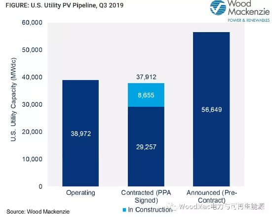 據(jù)WoodMackenzie(伍德麥肯茲)和太陽能產(chǎn)業(yè)協(xié)會(huì)(Solar Energy Industries Association,SEIA)聯(lián)合出品的最新研究U.S. Solar Market Insight Report《美國(guó)光伏市場(chǎng)研究報(bào)告》,美國(guó)公共事業(yè)規(guī)模光伏儲(chǔ)備項(xiàng)目容量達(dá)37.9GW,突破了2018年的紀(jì)錄15GW,再創(chuàng)新高。由于公用事業(yè)規(guī)模的光伏項(xiàng)目交易增加,自上個(gè)季度以來,未來五年預(yù)測(cè)再次上調(diào)6GW容量。 2019年上半年,公開發(fā)布的公用事業(yè)規(guī)模光伏項(xiàng)目容量飆升至11.2GW,僅在第二季度就收獲了6.2GW。此外,戶用光伏市場(chǎng)也從去年同期反彈。 美國(guó)公共事業(yè)光伏儲(chǔ)備容量,2019年三季度