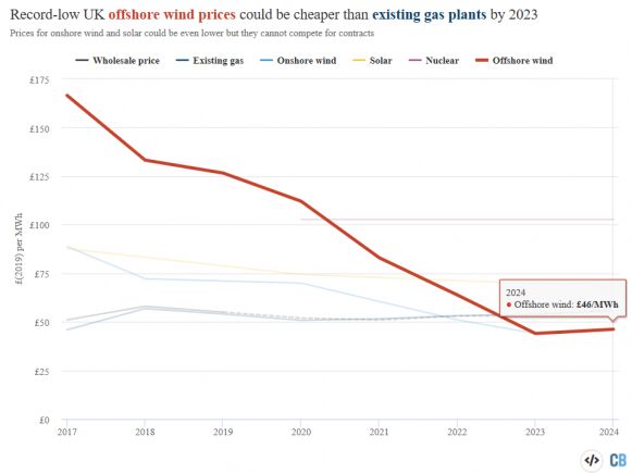 2019年9月20日,英國6個海上風電場(總計5.5GW)競標結果揭曉,報出創(chuàng)紀錄的低價:2023/24年開始運營的項目的價格為39.65英鎊/兆瓦時(按2012年價格,按通貨膨脹調整后為44英鎊/兆瓦時),而2024/25年的項目為41.61英鎊/兆瓦時。這些價格比政府的“參考價格”低8-9英鎊/兆瓦時,意味著這些新的海上風電場還將比現(xiàn)有的燃氣發(fā)電站更便宜地發(fā)電。預計這些海上風電項目每年將生產約290億千瓦時(29TWh)的電力,相當于英國2018年總發(fā)電量的9%,足以為英國2600萬戶家庭中的四分之一供電。按照英國的電力市場機制和市場趨勢,這些風電項目不但會收取任何補貼,反而會在2017年前向消費者回饋近6億英鎊。