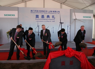西門子在華首家風(fēng)機(jī)設(shè)備制造廠——西門子風(fēng)力發(fā)電葉片(上海)有限公司今天在上海臨港區(qū)破土動工,作為積極拓展其全球風(fēng)機(jī)生產(chǎn)網(wǎng)絡(luò)的重要舉措,此舉標(biāo)志著西門子正式進(jìn)軍中國風(fēng)電市場。西門子風(fēng)力發(fā)電葉片(上海)有限公司的初期投資為5.81億元人民幣(6400萬歐元);工廠計劃于2010年下半年投入運(yùn)營,屆時將更好的滿足中國及出口市場對風(fēng)機(jī)設(shè)備的大量需求。上海市副市長艾寶俊、西門子股份公司管理委員會成員兼能源業(yè)務(wù)領(lǐng)域首席執(zhí)行官戴恩和西門子?xùn)|北亞業(yè)務(wù)區(qū)首席執(zhí)行官、西門子(中國)有限公司總裁兼首席執(zhí)行官郝睿強(qiáng)博士共同為工廠奠基。