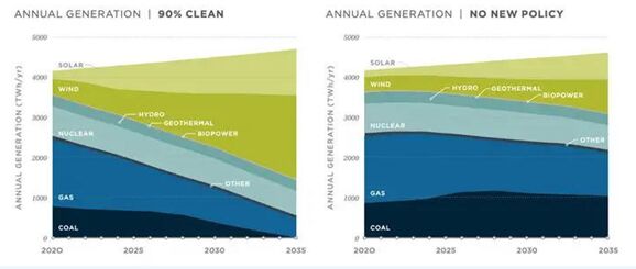 左圖是立法者頒布新政策后要求達(dá)到的電力構(gòu)成,右圖是沒有新政策情況下的電力構(gòu)成。(數(shù)據(jù)來源于加州大學(xué)伯克利公共政策學(xué)院)。由上往下的順序依次是太陽能、風(fēng)能、核能、燃?xì)、燃煤?梢钥闯觯C布新政策后,到2035年風(fēng)能發(fā)電將占據(jù)最大比例,其次是太陽能、核能、燃?xì)獍l(fā)電、燃煤發(fā)電(幾乎為零)。 這項研究利用了美國國家可再生能源實(shí)驗室的研究樣本。研究發(fā)現(xiàn),當(dāng)可再生能源比例達(dá)到90%時,每年可創(chuàng)造超過 50萬個密集型勞動就業(yè)機(jī)會,這也許可以幫助美國克服當(dāng)前的經(jīng)濟(jì)衰退。報告發(fā)現(xiàn),到2050年,90%的清潔能源轉(zhuǎn)變,可以使美國人免于有毒污染,從而挽救多達(dá)85000人的生命。 斯坦福大學(xué)環(huán)境工程學(xué)教授Mark Jacobson認(rèn)為,這份報告不夠雄心勃勃,他說:“我相信他們的目標(biāo)能夠?qū)崿F(xiàn),但我認(rèn)為我們可以更進(jìn)一步!薄暗奖臼兰o(jì)中葉,完全依靠風(fēng)能、太陽能和水力發(fā)電是可能的!