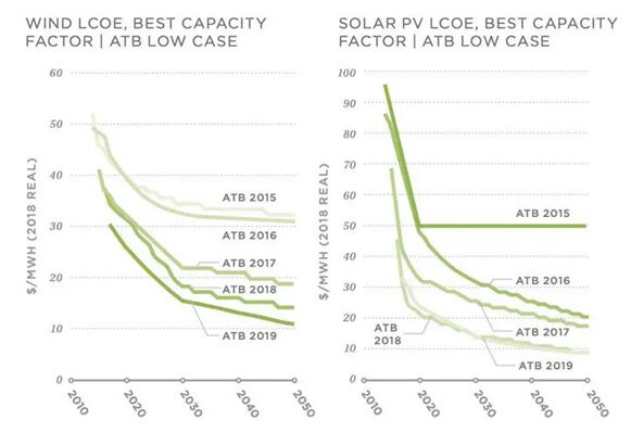 圖為美國國家可再生能源實(shí)驗室的年度技術(shù)基準(zhǔn)(ATB)對未來風(fēng)能和太陽能的成本預(yù)測。從圖中可以看出,風(fēng)能和太陽能發(fā)電的成本下降速度一直都過預(yù)期。 “技術(shù)發(fā)展的速度通常被低估了,”加州大學(xué)伯克利分校的能源研究科學(xué)家AmolPhadke說,“在我的職業(yè)生涯中,我所有的預(yù)測都是保守的!