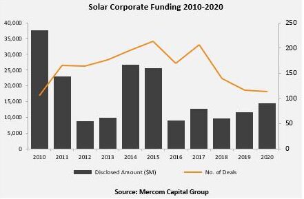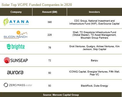 2020年上半年,由于突如其來的新冠疫情席卷全球,全球太陽能企業(yè)融資同比下降25%,但下半年復(fù)蘇迅速且廣泛,全年實現(xiàn)增長24%。其中,公開上市的太陽能公司度過了前所未有的一年。太陽能ETF上漲了225%,到2020年有15只太陽能股票上漲了100%以上。 Mercom Capital Group首席執(zhí)行官Raj Prabhu表示:“太陽能資產(chǎn)的收購在大流行的一年中達到了歷史最高水平,并且已經(jīng)成為投資天堂,尤其是在不確定的COVID經(jīng)濟中變得越來越受歡迎。” 2020年,太陽能行業(yè)的全球風(fēng)險投資和私募股權(quán)(VC/PE)達到41筆交易,累計規(guī)模12億美元,而2019年的53筆交易為14億美元。