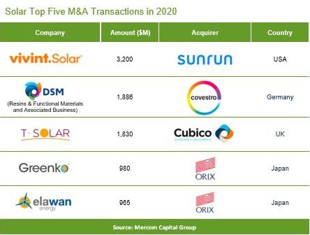 2020年獲得風(fēng)險投資最多的公司是Ayana Renewable Power,籌集了3.9億美元; Silicon Ranch Corporation,籌集了2.25億美元;Brighte籌集了7600萬美元;Sunseap Group籌集了7200萬美元;Aurora Solar和Zero Mass Water各自籌集了5,000萬美元。 到2020年,共有102家風(fēng)險投資和私募股權(quán)投資者參與了融資交易,其中有五家參與了多輪融資。 2020年,公開市場融資增長101%,達到51億美元。Array Technologies在2020年第四季度的首次公開募股(IPO)中籌集了12億美元。 2020年,宣布的債務(wù)融資達到83億美元,同比增長6.4%。2020年記錄了8筆證券化交易,總計22億美元,這是一年中通過證券化融資的最大金額。 2020年第四季度,大型項目的最大投資方是法國興業(yè)銀行,該行投資了五個項目。其次是三井住友銀行,投資了四個項目。法國農(nóng)業(yè)信貸銀行,歐洲復(fù)興開發(fā)銀行(EBRD)和美洲投資公司(IDB Invest),分別投資了三個項目。 2020年,太陽能領(lǐng)域完成了62項并購交易,而2019年為65項。大多數(shù)交易涉及太陽能下游企業(yè)。2020年最大的一筆交易是Sunrun以32億美元的全股票交易收購了Vivint Solar。