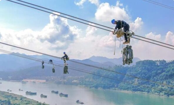 廣東電網(wǎng)能源發(fā)展有限公司的高空作業(yè)人員進(jìn)行跨越西江段的間隔棒安裝
