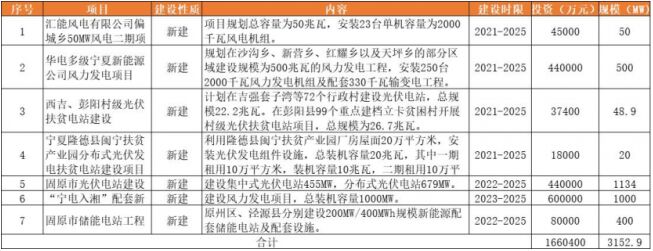 近期,固原市人民政府辦公室印發(fā)固原市自然資源保護和利用“十四五”規(guī)劃的通知。根據光伏們查詢,在固原市自然資源保護和利用“十四五”規(guī)劃建設項目庫中,有關清潔能源產業(yè)的項目共10個。其中包括光伏、風電、儲能的項目共7個,合計新能源新建規(guī)模3152.9MW,總投資金額166億元。具體項目名單如下: