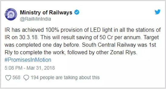 3月30日,印度鐵路在官方推特上宣布,已在印度鐵路的所有車站實(shí)現(xiàn)了100%的LED照明供應(yīng)。此舉將每年節(jié)省50億盧比(約4.8億人民幣)。