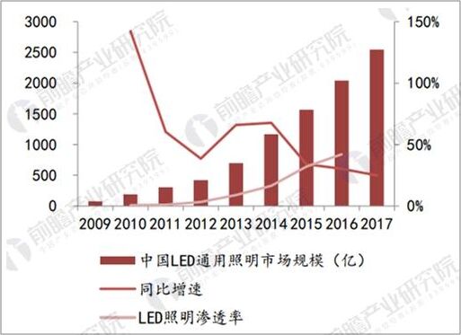 近年來(lái),我國(guó)LED產(chǎn)業(yè)高速發(fā)展,滲率不斷提升。據(jù)前瞻產(chǎn)業(yè)研究院發(fā)布的《LED照明產(chǎn)業(yè)市場(chǎng)前瞻與投資戰(zhàn)略規(guī)劃分析報(bào)告》數(shù)據(jù)顯示,中國(guó)LED照明行業(yè)規(guī)模從78億元擴(kuò)張超過(guò)2550億元,09-17年CAGR高達(dá)54.62%,LED通用照明市場(chǎng)的快速擴(kuò)張,主因是通用照明行業(yè)的擴(kuò)張與LED照明滲透率的提升,LED照明滲透率由2010年的0.6%升至2016年的42%。