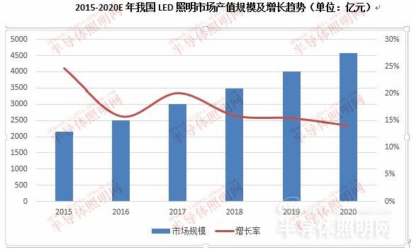 2015-2020E年我國LED照明市場產(chǎn)值規(guī)模及增長趨勢 數(shù)據(jù)來源:OFweek產(chǎn)業(yè)研究院