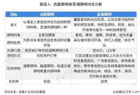 功能照明和景觀照明為我國照明工程兩大市場 照明工程行業(yè)主要可分為功能照明和景觀照明,由于目的性不同,兩大細(xì)分市場在照明對象、照明性質(zhì)、光源燈具和照明方式等均有所不同,在應(yīng)用領(lǐng)域也各有側(cè)重。 具體來看,功能照明以滿足人類視覺作業(yè)為主要目的,因此其應(yīng)用領(lǐng)域主要為道路照明、隧道照明、軌道交通照明和室內(nèi)照明等,行業(yè)毛利率較低;而景觀照明主要以重塑景觀的白日風(fēng)范,以及呈現(xiàn)美的視覺效果為目的,具備觀賞和美化環(huán)境的作用,因此其應(yīng)用場景主要為橋梁景觀亮化、廣場景觀亮化、商場景觀亮化、樓宇景觀亮化以及特殊建筑物和特殊自然載體如山體、胡泊、樹木、溶洞、河流和水面亮化等。