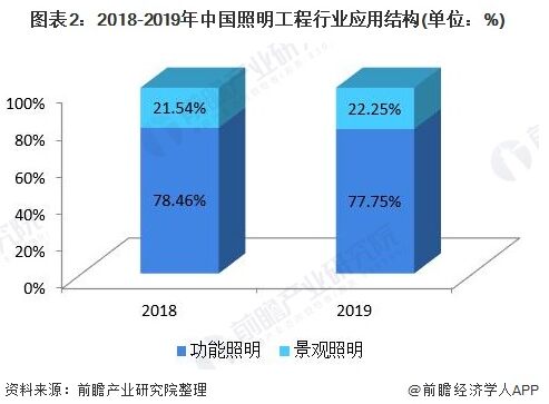 其中,功能性照明目前占主導(dǎo)地位,而景觀照明的市場份額占比則在逐漸上升。2018年,我國功能性市場規(guī)模為3408億元,占比約為78.46%;至2019年,功能性照明市場規(guī)模占比下降至77.75%,而景觀照明市場份額則上升至22.25%。