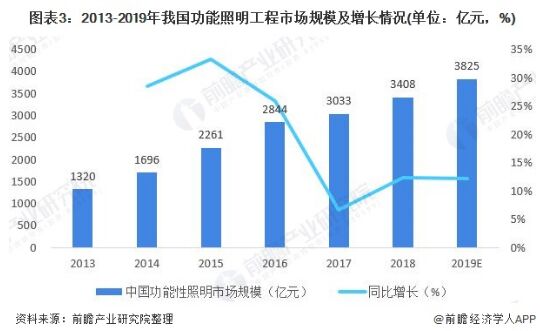 功能性照明:智能化是未來趨勢 2013-2019年,我國功能照明市場實現(xiàn)快速增長,從2013年的1320億元增長至2018年的3408億元,年均復(fù)合增速達(dá)到20.8%。2019年,行業(yè)市場規(guī)模進(jìn)一步擴大,達(dá)到3825億元左右。