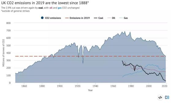 據(jù)英國CarbobBrief匯總的數(shù)據(jù),英國2019年的二氧化碳排放量約為3.54億噸,比上一年下降2.9%。這是英國的碳排放連續(xù)第七年下降,比1990年的水平低41%,意味著英國2019年的碳排放量降至1888年的水平。
