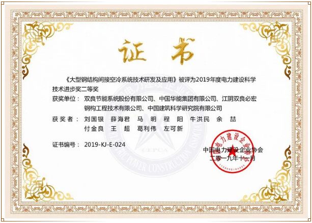 這兩座由雙良人打造的綠色建筑,是我國間冷塔由鋼筋混凝土結(jié)構(gòu)形式發(fā)展為全鋼結(jié)構(gòu)形式的里程碑,是我國在大型火力發(fā)電主機(jī)間冷鋼塔建造史上零的突破,被業(yè)內(nèi)專家譽(yù)為火力發(fā)電行業(yè)的高科技工程、資源節(jié)約型工程、循環(huán)經(jīng)濟(jì)示范工程,榮獲“2019年度電力建設(shè)科學(xué)技術(shù)進(jìn)步獎(jiǎng)”。 近日,雙良節(jié)能系統(tǒng)股份有限公司(簡稱雙良節(jié)能)再獲殊榮——電力建設(shè)科學(xué)技術(shù)進(jìn)步獎(jiǎng),該獎(jiǎng)項(xiàng)由中國電力建設(shè)企業(yè)協(xié)會(huì)(簡稱中電建協(xié))組織評(píng)選,是電力建設(shè)行業(yè)的最高科學(xué)技術(shù)獎(jiǎng)。雙良節(jié)能憑借《大型鋼結(jié)構(gòu)間接空冷系統(tǒng)技術(shù)研發(fā)及應(yīng)用》被評(píng)為2019年度電力建設(shè)科學(xué)技術(shù)進(jìn)步獎(jiǎng)二等獎(jiǎng)。
