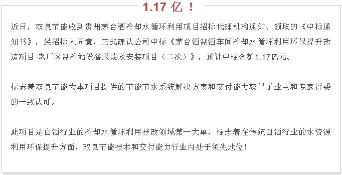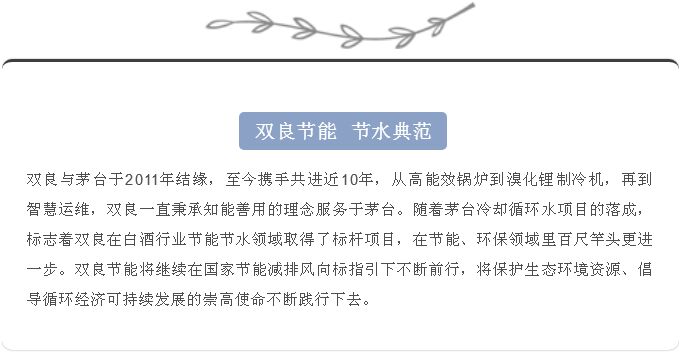 經(jīng)過雙良節(jié)能全體員工的共同努力,茅臺(tái)冷卻循環(huán)水項(xiàng)目順利投用。茅臺(tái)酒制酒車間冷卻水循環(huán)利用提升改造項(xiàng)目,是貴州茅臺(tái)酒股份有限公司“十三五規(guī)劃”中強(qiáng)化生態(tài)建設(shè)和節(jié)能減排的重點(diǎn)項(xiàng)目,在堅(jiān)守茅臺(tái)酒傳統(tǒng)釀酒工藝下歷時(shí)了8年的研究與試驗(yàn),如今得以建成,實(shí)現(xiàn)了赤水河寶貴水資源的循環(huán)利用,對(duì)保護(hù)赤水河生態(tài)起到積極的示范和引領(lǐng)作用。 雙良節(jié)能中標(biāo)《茅臺(tái)酒制酒車間冷卻水循環(huán)利用提升改造項(xiàng)目——中華片區(qū)制冷站設(shè)備采購及安裝項(xiàng)目》,該項(xiàng)目通過對(duì)制酒生產(chǎn)冷卻水的循環(huán)利用改造,實(shí)現(xiàn)了釀酒傳統(tǒng)工藝的堅(jiān)守和環(huán)保標(biāo)準(zhǔn)提升的高度融合。