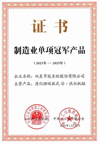 雙良溴化鋰吸收式冷 / 溫水機組榮獲由工信部、中國工業(yè)經(jīng)濟聯(lián)合會共同頒發(fā)的“ 中國制造業(yè)單項冠軍產(chǎn)品 ”證書。