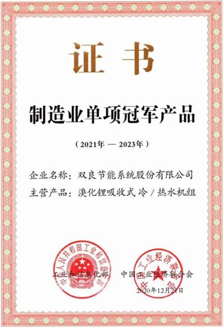 雙良溴化鋰吸收式冷 / 溫水機(jī)組榮獲由工信部、中國(guó)工業(yè)經(jīng)濟(jì)聯(lián)合會(huì)共同頒發(fā)的“ 中國(guó)制造業(yè)單項(xiàng)冠軍產(chǎn)品 ”證書。