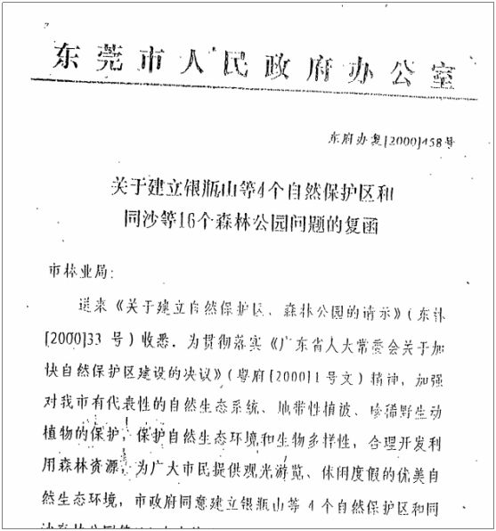 次年,東莞市人民政府大力推動(dòng)生態(tài)文明建設(shè),2000年12月,東莞市林業(yè)局給東莞市人民政府送去《關(guān)于建立自然保護(hù)區(qū)、森林公園的請(qǐng)示》。東莞市人民政府于2000年12月21日批準(zhǔn)了《關(guān)于建立銀屏山等四個(gè)自然保護(hù)區(qū)和同沙水庫(kù)等16個(gè)森林公園問(wèn)題的復(fù)函》,其中就包括觀音山森林公園(東府辦復(fù)【2000】458 號(hào)文),位于樟木頭鎮(zhèn),由石新、古坑、樟洋、官倉(cāng)等村部分林地組成,總面積26178畝。