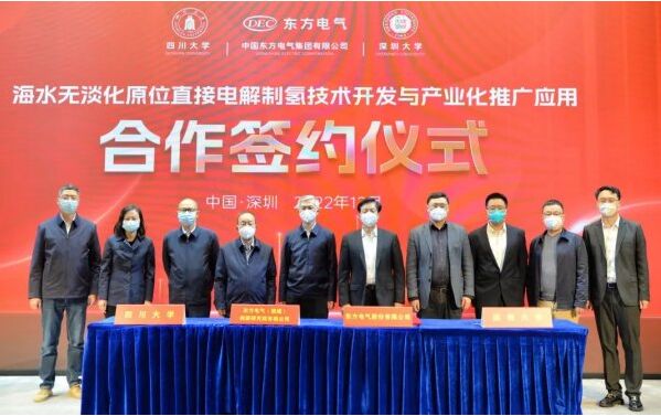2022年12月16日,東方電氣股份有限公司、東方電氣(福建)創(chuàng)新研究院有限公司與四川大學(xué)/深圳大學(xué)謝和平院士團(tuán)隊(duì)在深圳簽署“海水無淡化原位直接電解制氫原創(chuàng)技術(shù)中試和產(chǎn)業(yè)化推廣應(yīng)用”的四方合作協(xié)議。中國工程院院士謝和平,東方電氣集團(tuán)黨組成員、副總經(jīng)理張彥軍,深圳大學(xué)副校長汪永成等出席簽約儀式。