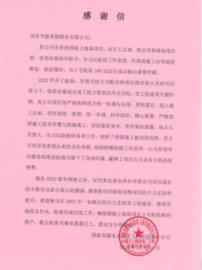 給雙良節(jié)能的感謝信