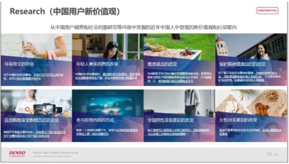 特別是年輕一代已經(jīng)成為車市的消費(fèi)主力,其消費(fèi)觀念與此前存在巨大差異。2022年上半年,電裝針對(duì)Z世代(1995-2009年出生)年輕人群開(kāi)展了一次針對(duì)性的調(diào)研活動(dòng)。通過(guò)問(wèn)卷調(diào)調(diào)查、用戶訪談、專家訪談,以及對(duì)未來(lái)需求的共創(chuàng)討論發(fā)現(xiàn),中國(guó)年輕人對(duì)座艙的需求主要反映在以下幾個(gè)方面:第一,追求科技感的設(shè)計(jì);第二,追求更多的車內(nèi)可自定義功能;第三,是對(duì)智能化的需求,希望車能主動(dòng)感知人的狀態(tài),主動(dòng)感知車內(nèi)車外的環(huán)境,然后主動(dòng)提供各種功能跟服務(wù)。