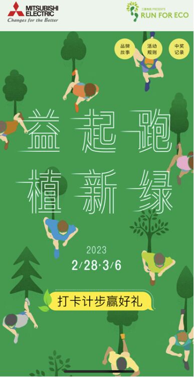 2023年2月28日至3月6日,三菱電機(中國)有限公司(以下簡稱“三菱電機”)再度攜手中華環(huán)境保護基金會,發(fā)起RUN FOR ECO“益起跑 植新綠”線上公益活動,該活動旨在為關(guān)心環(huán)境問題的社會各界人士提供社會貢獻的平臺,將環(huán)保與跑步運動巧妙地融合在一起,無論男女老少皆可輕松參與,通過打卡累計步數(shù)獲取的EcoPoint積分換算成相應(yīng)的善款,以支持中國環(huán)保事業(yè)。