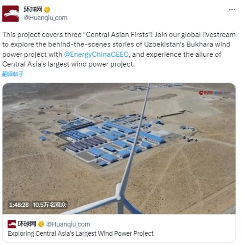 2013年9月,共建絲綢之路經(jīng)濟(jì)帶重大倡議提出,至今已整十年。在這重要?dú)v史節(jié)點(diǎn),環(huán)球網(wǎng)聯(lián)合中國能建于北京時間9月25日16:00策劃了“風(fēng)起絲路,電連天涯:探秘中亞第一大風(fēng)力發(fā)電項(xiàng)目”海外直播活動,通過臉書、推特等海外社交媒體平臺,帶領(lǐng)全球觀眾一起聆聽烏茲別克斯坦布哈拉風(fēng)電項(xiàng)目建設(shè)的幕后故事,近距離感受中國企業(yè)為推動世界綠色低碳發(fā)展做出的切實(shí)行動,見證“一帶一路”上建設(shè)者們的風(fēng)采。