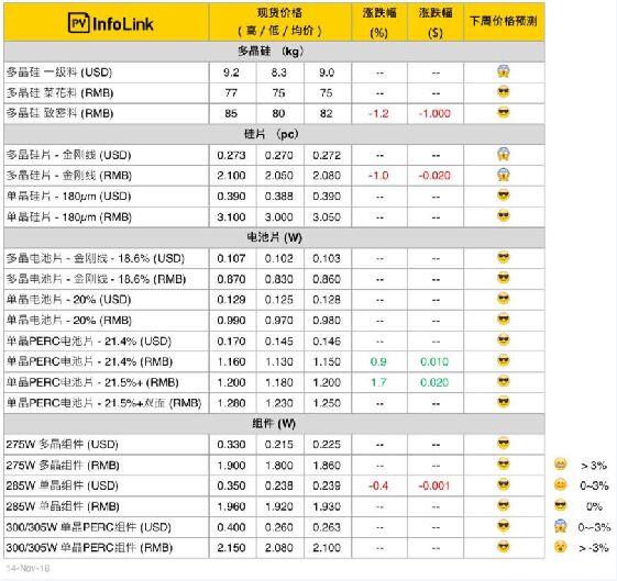 硅料價(jià)格 11月以來硅料價(jià)格基本持穩(wěn),雖然本周致密料價(jià)格些微下降,但主流價(jià)格與上周維持在差不多的水平。菜花料價(jià)格也維持在每公斤75-77元人民幣之間。 目前市場上買賣雙方對于成交價(jià)格還是較為保守,在此情況下,單晶硅片廠轉(zhuǎn)而想多用菜花料,而多晶硅片廠多用珊瑚料來降低原料成本。目前硅料的供需尚穩(wěn)定,預(yù)估國內(nèi)硅料的價(jià)格走勢在年底前都是較為平緩的態(tài)勢。海外部分則是高、低價(jià)持續(xù)往下,主流價(jià)格也仍是在每公斤9美元往下議價(jià)。 硅片價(jià)格 本周單、多晶硅片價(jià)格在硅料價(jià)格穩(wěn)定的情況下變動(dòng)不大。國內(nèi)多晶硅片的成交價(jià)微幅下修,但在硅料價(jià)格沒有繼續(xù)大幅降價(jià)的情況下,預(yù)估也即將落底。 目前整體多晶硅片的開工率較為減少,在沒有過多的供應(yīng)下,11月底前主流價(jià)格應(yīng)能保持在每片2.05元人民幣上下。海外多晶硅片價(jià)格基本也保持在每片0.27元美金之上。 單晶硅片價(jià)格本周基本不變,但需求明顯轉(zhuǎn)好,盡管測算硅料成本,單晶硅片價(jià)格還有空間下修,但預(yù)計(jì)價(jià)格在12月調(diào)整的可能性較高。 電池片價(jià)格 多晶電池片隨著硅片價(jià)格逐漸落底、加上印度需求略有回升,短期內(nèi)價(jià)格較有支撐,本周價(jià)格維持在上周每瓦0.84-0.87元人民幣、0.103-0.107元美金的水平。 單晶方面,隨著應(yīng)用領(lǐng)跑者的持續(xù)搶裝,21.5%+的PERC電池片供應(yīng)將一路緊張至年底,由于市場上一片難求,單面21.5%+的PERC電池片本周價(jià)格再度上調(diào)0.02元人民幣,市場主流價(jià)格靠攏每瓦1.2元人民幣。雙面高效電池片本周則仍是高檔持穩(wěn)在每瓦1.25元人民幣。 在廠商陸續(xù)完成SE的調(diào)適之后,SE變?yōu)镻ERC電池片的標(biāo)準(zhǔn)配備,市場上轉(zhuǎn)換效率21.4%及以下的單晶PERC電池片供應(yīng)越來越少,逐漸變?yōu)榉侵髁鳟a(chǎn)品,本周維穩(wěn)在上周水平。 海外價(jià)格變化較大的部分在臺(tái)灣市場,受到臺(tái)灣市場年底并網(wǎng)的小幅搶裝潮推動(dòng),臺(tái)灣各家單晶PERC電池片報(bào)價(jià)持續(xù)上揚(yáng),在上周靠攏每瓦0.165元美金之后,本周有廠商繼續(xù)挑戰(zhàn)每瓦0.17元美金,漲幅明顯。 組件價(jià)格 組件與電池片一樣呈現(xiàn)PERC產(chǎn)品供應(yīng)緊張的態(tài)勢。尤其領(lǐng)跑者所需的單面、雙面310W PERC組件一片難求,單面價(jià)格來到每瓦2.2元人民幣上下。300 / 305W 組件海內(nèi)外都有需求支撐、供應(yīng)也因?yàn)殡姵仄嵝Ф饾u減少,價(jià)格穩(wěn)定。