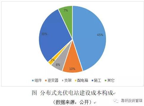 格爾木的建設成本 光伏項目的運維成本和非技術成本不是影響行業(yè)的主要因素,對于光伏行業(yè)來說建設成本是最關鍵的因素,降低技術成本是未來光伏平價上網(wǎng)的主要驅動力。所以這里不再討論非技術成本與運維成本。當然非技術成本也有降低空間。 我們分解下建設成本中的各部分細分成本,這樣我們就可以大概的估算“降本增效”部分為光伏投資成本帶來的成本下降空間。我們可以參考分布式電站成本一般構成,如下圖,組件與施工兩項占比達75%左右,其次逆變器占成本10%左右。這也基本代表了目前光伏電站一個普遍的成本構成。 我們以表格形式呈現(xiàn)格爾木項目中主要的設備成本及其他數(shù)據(jù)參數(shù)。