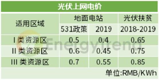 競價(jià)配置項(xiàng)目 上網(wǎng)指導(dǎo)電價(jià):Ⅰ類地區(qū)0.4元/千瓦時(shí)、Ⅱ類地區(qū)0.45元/千瓦時(shí)、Ⅲ類地區(qū)0.55元/千瓦時(shí)。 集中式 531政策后,由于暫不安排2018年普通光伏電站建設(shè)規(guī)模,以及2019年度光伏政策未下發(fā)的不確定下,目前一季度光伏裝機(jī)容量為2.4GW。 2019年度的集中式光伏電站上網(wǎng)電價(jià)通過市場競爭方式確定,將三類資源區(qū)集中式電站標(biāo)桿上網(wǎng)電價(jià)改為指導(dǎo)價(jià),不得超過所在資源區(qū)指導(dǎo)價(jià)。 工商業(yè)分布式 2019年7月開始,工商業(yè)分布式光伏項(xiàng)目一律通過競價(jià)方式進(jìn)行指標(biāo)配置,無論是“自發(fā)自用,余量上網(wǎng)”的還是“全額上網(wǎng)”的項(xiàng)目,市場競爭形成的價(jià)格既不得超過指導(dǎo)價(jià)。 其中“自發(fā)自用,余電上網(wǎng)”的項(xiàng)目按全電量0.1元補(bǔ)貼,補(bǔ)貼標(biāo)準(zhǔn)也不得超過每千瓦時(shí)0.1元。 已明確規(guī)模項(xiàng)目 戶用光伏 2018年531政策中,能源局明確了分布式規(guī)模10GW,但在今年戶用單獨(dú)配置的情況下,根據(jù)2019年一季度分布式光伏總量2.8GW,按財(cái)政部30億的補(bǔ)貼中,戶用7.5億配置來看,戶用光伏在0.18元的高補(bǔ)貼,擬定3.5GW的裝機(jī)規(guī)模下,還是極具吸引力的。 光伏扶貧 由于光伏扶貧項(xiàng)目不在財(cái)政部下發(fā)的30億元補(bǔ)貼的大盤子中,按單獨(dú)補(bǔ)貼計(jì)算,剩下的22.5億元光伏補(bǔ)貼將流入競價(jià)配置項(xiàng)目中。 而早些時(shí)候發(fā)布的“十三五”第二批光伏扶貧電站中提到,本次下達(dá)的光伏扶貧項(xiàng)目原則上應(yīng)在2019年底前全容量建成并網(wǎng),“十三五”第一批光伏扶貧項(xiàng)目須在2019年6月30日(含)前全容量建成并網(wǎng)。未按期建成并網(wǎng)的項(xiàng)目視為自動(dòng)放棄,不再納入國家光伏扶貧目錄。 結(jié)合國家能源局第二批光伏扶貧電站下達(dá)的1.67GW裝機(jī)規(guī)模,加上2017年公布第一批扶貧電站4.2GW的裝機(jī)規(guī)模中未并網(wǎng)的項(xiàng)目,在上網(wǎng)電價(jià)仍維持每千瓦時(shí)0.65元、0.75元、0.85元執(zhí)行的情況下,光伏扶貧項(xiàng)目需求動(dòng)能已全面開啟。
