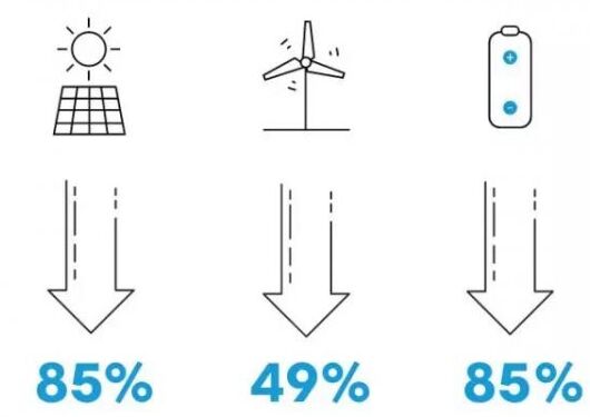 2010年以來(lái),太陽(yáng)能、風(fēng)能和電池的成本下降比例 圖片來(lái)源:BNEF