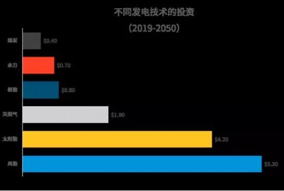 風(fēng)能與太陽(yáng)能的投資將分別達(dá)到5.3萬(wàn)億美元和4.2萬(wàn)億美元 數(shù)據(jù)來(lái)源:BNEF
