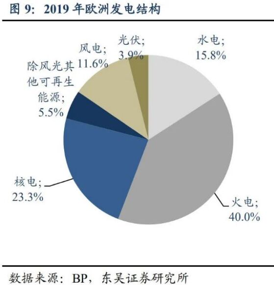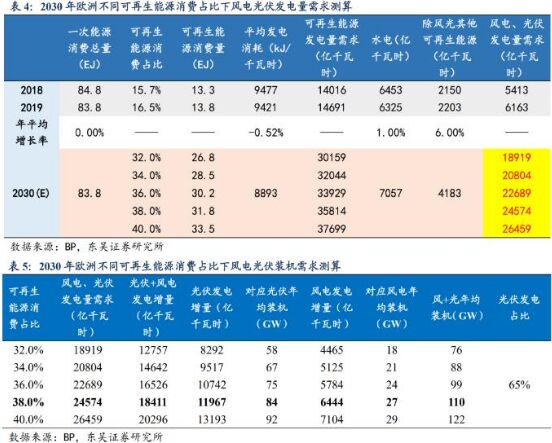 光伏逐步成長為主力能源形式:從2019年歐洲發(fā)電結(jié)構(gòu)看,主要能源還是以火電為主,占比40%,可再生能源主要以水電、風(fēng)電為主,合計(jì)占比36.7%,光伏發(fā)電占比僅3.9%。假設(shè)2030年可再生能源消費(fèi)結(jié)構(gòu)占比提高到38%的水平,據(jù)我們測(cè)算,預(yù)計(jì)到2030年,火電地位弱化,發(fā)電占僅22.2%;可再生能源發(fā)電占比約65%,相比2019年提升超20pct。光伏逐漸成長為主力能源形式,發(fā)電占比27.1%,成為歐洲發(fā)電結(jié)構(gòu)中占比最大的能源形式。