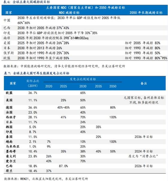 全球范圍看,碳排放趨嚴(yán),利好可再生能源發(fā)展 新政策密集落地,碳排放標(biāo)準(zhǔn)趨嚴(yán),可再生能源發(fā)展勢(shì)不可擋。全球?qū)τ谔寂欧、氣候變化的關(guān)注和重視程度逐漸提高,大國均提出近5-10年碳排放目標(biāo),強(qiáng)調(diào)未來30年內(nèi)的可再生能源發(fā)電占比目標(biāo),帶動(dòng)全球向“碳中和”方向發(fā)展。 中國:十四五規(guī)劃即將出臺(tái)征求意見稿,2019年非化石能源占能源消費(fèi)比重已達(dá)15.3%,提前一年完成“十三五”規(guī)劃目標(biāo)?紤]到成本快速下降,且中國高層領(lǐng)導(dǎo)與政策層面對(duì)可再生能源的重視,我們預(yù)計(jì)非化石能源消費(fèi)占比20%戰(zhàn)略目標(biāo)將提前完成。碳排放方面,我國計(jì)劃到2030年單位GDP的碳強(qiáng)度較2005年下降60-65%。 德國:本周德國聯(lián)邦財(cái)政部發(fā)布的《可再生能源》(2021)修正案草案中指出,1)2021-2028年,德國將對(duì)18.8GW(分布式5.3GW+集中式13.5GW)的光伏發(fā)電項(xiàng)目進(jìn)行公開招標(biāo),旨在促進(jìn)光伏發(fā)電成本的進(jìn)一步降低,預(yù)計(jì)到2028年大型地面光伏電站的價(jià)格將從0.075下降至0.059歐元/kWh,8年內(nèi)降幅達(dá)21.3%。2)取消對(duì)可再生能源電站為期20年的補(bǔ)貼政策,這標(biāo)志著可再生能源發(fā)展由從政策驅(qū)動(dòng)轉(zhuǎn)向市場(chǎng)驅(qū)動(dòng)。2019年德國可再生能源占比36.6%,該政策的出臺(tái),將刺激可再生能源發(fā)電的市場(chǎng)化發(fā)展,早日實(shí)現(xiàn)25年可再生能源占比40-50%、2030年占比65%的目標(biāo)。 印度:今年9月莫迪總理在世界太陽能技術(shù)峰會(huì)上指出,印度可再生能源目標(biāo)將再次上調(diào),到2022年非化石燃料發(fā)電量目標(biāo)由175GW提升至220GW。目前印度的可再生能源占比僅8.7%,遠(yuǎn)低于世界平均水平,隨近年來全球光伏風(fēng)電市場(chǎng)的迅速發(fā)展,印度政府多次上調(diào)發(fā)展指引,以高目標(biāo)推動(dòng)可再生能源產(chǎn)業(yè)的發(fā)展,以實(shí)現(xiàn)到2030年可再生能源占比達(dá)到40%的目標(biāo)。 美國:今年7月拜登提出氣候計(jì)劃,未來4年投資2萬億美元加強(qiáng)美國的清潔能源基礎(chǔ)設(shè)施建設(shè),以減少對(duì)化石燃料的依賴,力爭(zhēng)在2035年前實(shí)現(xiàn)無碳發(fā)電,這意味著美國2030年可再生能源發(fā)電占比50%的目標(biāo)將進(jìn)一步上調(diào),若此項(xiàng)計(jì)劃得以實(shí)施,我們預(yù)計(jì)美國大型地面電站規(guī)模將進(jìn)一步擴(kuò)大,光伏裝機(jī)將持續(xù)高增長。