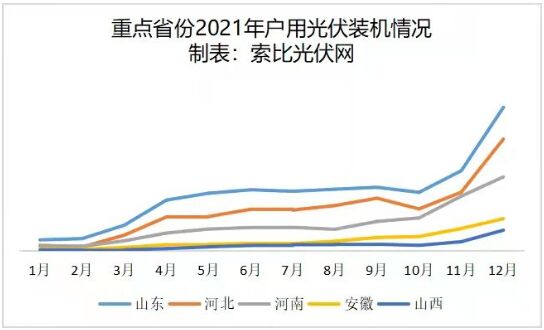 從2021年各省戶用光伏裝機規(guī)?,山東、河北、河南依然是最核心的三個主力市場,安徽、山西、江西、福建、江蘇等5個省也實現(xiàn)了裝機超400MW、占比超2%的目標。