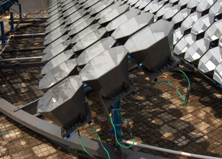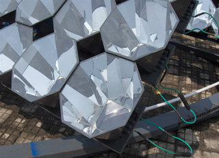 在我國,陳應(yīng)天教授發(fā)明了一種結(jié)構(gòu)簡單的二維聚光光漏斗,此光漏斗是一種八面體聚光器,以工程塑料一次注塑成型,經(jīng)過封裝,實(shí)現(xiàn)了均勻的一次反射式聚光。光漏斗的聚光比的設(shè)計(jì)依照用戶地區(qū)的全年平均光照質(zhì)量而定:在陽光一類地區(qū)使用4倍的聚光比,在陽光二類地區(qū)使用3倍的聚光比,在陽光三類地區(qū)使用2倍的聚光比,在其它云雨多、散射光非常充裕的地區(qū),使用固定的平板式電池已足夠,無需使用聚光和跟蹤裝置,因?yàn)樽饔貌淮蟆M瑫r(shí)陳應(yīng)天教授發(fā)明了一種方法,可以有效散熱,制成一個單片光電池的組件,光漏斗和一個光伏電池組件組成一個發(fā)電單元,可以在4個太陽聚光條件下可靠的工作。這種光漏斗法的聚光組件發(fā)明已經(jīng)申請了國家發(fā)明專利。根據(jù)不同的應(yīng)用需求,一臺發(fā)電機(jī)可以由18、36或更多的分離式的發(fā)電單元組成。由于是聚光型,發(fā)電機(jī)必須跟蹤太陽,為此,陳應(yīng)天教授發(fā)明了一種簡易、巧妙的計(jì)數(shù)方法,制造了低成本、可靠且準(zhǔn)確的太陽跟蹤控制裝置,將數(shù)倍聚光光伏電池發(fā)電機(jī)的發(fā)電量在此聚光的基礎(chǔ)上再提高20%-30%。