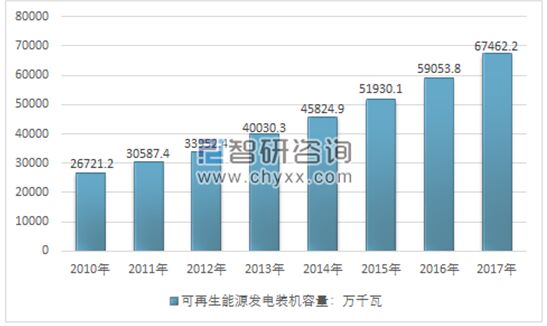 能源生產和消費革命將進一步激發(fā)天然氣需求。在經濟增速換檔、資源環(huán)境約束趨緊的新常態(tài)下,能源綠色轉型要求日益迫切,能源結構調整進入油氣替代煤炭、非化石能源替代化石能源的更替期,優(yōu)化和調整能源結構要求大力提高天然氣消費比例。 智研咨詢發(fā)布的《2018-2024年中國可再生能源市場分析預測及投資戰(zhàn)略研究報告》內容指出:2017年中國可再生能源裝機總量達到了67462.2萬千瓦,其中風電1.89億千瓦;水電3.41億千瓦;地熱太陽能1.3億千瓦。