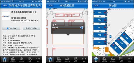 (五)參展名單&展位圖 在“參展名單”中可查看所有參展企業(yè)的會刊信息。點開任意一家展商名稱,該公司的名稱、地址、電話、傳真、網(wǎng)址和簡介便一目了然(見圖7)。點擊該公司的展位號,將自動跳轉到“展位圖”頁面,顯示出該公司的具體方位(見圖8)。通過“展位圖”您可以看到W1-W5,E1-E3八個展廳的展臺具體分布情況,實現(xiàn)對目標展商的快速定位。(見圖9)
