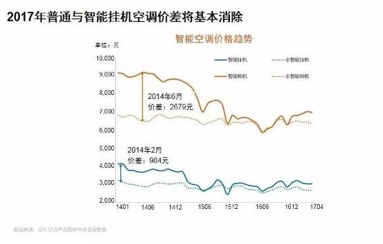 中國空調(diào)行業(yè)已加速向互聯(lián)網(wǎng)轉(zhuǎn)型 2014年,中國普通掛機空調(diào)與智能掛機空調(diào)價差近千元,柜機價差更是超過2500元,而到2017年價差已經(jīng)基本消除。