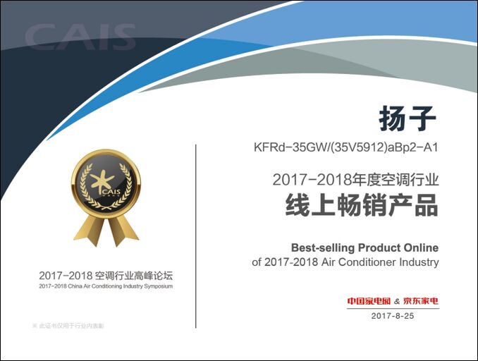 2017年8月25日,主題為“天氣論VS進化論”的2017-2018中國空調(diào)行業(yè)高峰論壇在京召開。會議對2017冷年以及2018冷年空調(diào)行業(yè)進行了盤點與趨勢分析,并對表現(xiàn)突出的品牌及產(chǎn)品進行了集中表彰。其中,揚子空調(diào)成功獲得“2017-2018中國空調(diào)行業(yè)節(jié)能標(biāo)桿品牌”,旗下明星產(chǎn)品KFRd-35GW/(35V5912)aBp2-A1、KFRd-52LW/(5211916)aBp2-A1則分別贏得“2017-2018中國空調(diào)行業(yè)線上暢銷產(chǎn)品”,“2017-2018中國空調(diào)行業(yè)創(chuàng)新設(shè)計產(chǎn)品”的殊榮。