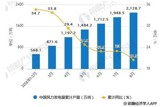 2018年1-8月中國(guó)風(fēng)力發(fā)電量產(chǎn)量統(tǒng)計(jì)及增長(zhǎng)情況