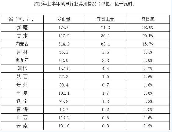 這說明,目前在中國火電還是占據(jù)了絕對(duì)的主導(dǎo)地位。而第二名的水電(發(fā)電量8326.2億千瓦時(shí)),前三季度增速只有4.4%,占比進(jìn)一步降到了16.53%。 “棄電”現(xiàn)象仍然嚴(yán)重 根據(jù)國家能源局?jǐn)?shù)據(jù),2018年上半年,全國棄風(fēng)電量182億千瓦時(shí),同比減少53億千瓦時(shí)。風(fēng)電行業(yè)雖然棄風(fēng)電量有所下降,但情形依舊嚴(yán)峻,特別是新疆、甘肅、內(nèi)蒙古棄風(fēng)率排名前三。