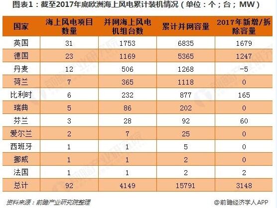 歐洲海上風(fēng)電發(fā)展現(xiàn)狀 隨著歐盟提出到2020年可再生能源占?xì)W盟總能源消費的20%,歐洲海上風(fēng)電呈現(xiàn)快速發(fā)展趨勢,已成為當(dāng)前全球最大的海上風(fēng)電行業(yè)市場。2017年,歐洲海上風(fēng)電新增裝機(jī)容量為3148MW,占全球海上風(fēng)電新增裝機(jī)容量72.6%,海上風(fēng)電累計裝機(jī)容量為15780MW,占全球海上風(fēng)電累計裝機(jī)容量83.9%。 其中,英國是全球海上風(fēng)電的第一大國,擁有海上風(fēng)電項目31個,并網(wǎng)海上風(fēng)電機(jī)組臺數(shù)1753臺,2017年新增裝機(jī)容量1679MW,累計并網(wǎng)容量達(dá)6835MW。德國自2012年以后逐漸成為世界上重要的風(fēng)電工程市場,其政府組織也明確提出必須在國內(nèi)開展新能源轉(zhuǎn)型工作,加大力度發(fā)展海上風(fēng)電行業(yè)。截至2017年,德國擁有海上風(fēng)電項目23個,并網(wǎng)海上風(fēng)電機(jī)組臺數(shù)1169臺,累計并網(wǎng)容量5355MW。